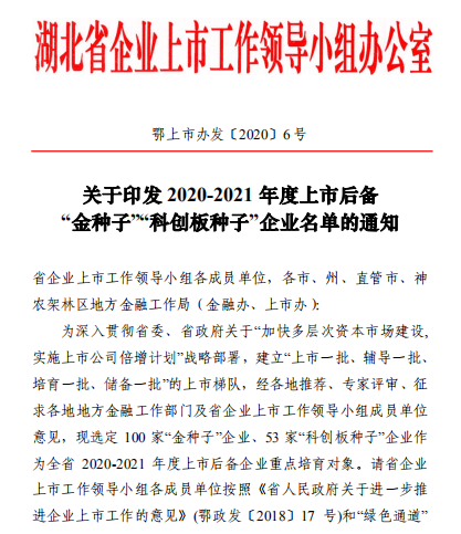 今年是湖北省委、省政府关于“加快多层次资本市场建设,实施上市公司倍增计划”战略部署的第三年,在全省范围内,遴选“金种子”“科创板种子”企业,旨在培育全省主营业务突出、动作规范、盈利良好、具备上市条件的企业,继续做好重点上市后备种子企业的培育工作。