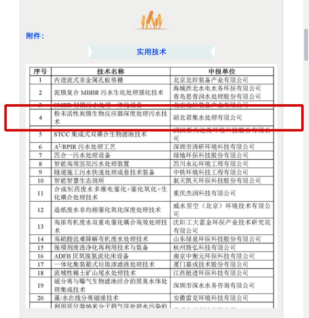 由湖北乐天使水处理有限公司自主研发的“粉末活性炭膜生物反应器深度处理污水技术”获评“2020年重点环境保护实用技术”称号。