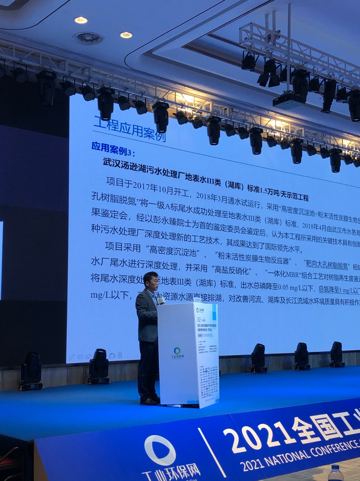 董俊展示了浙江省岱山县高亭城区污水处理厂 10000 m³/d一级B提升至一级A提标工程、张家港常阴沙污水处理厂提标改造项目 2000 m³/d 靶向大孔脱氮混排工艺、武汉汤逊湖污水处理厂地表水Ⅲ类(湖库)标准15000m³/d示范工程、义乌后宅及赤岸污水处理厂中试项目( 2000m³/d)等项目,这些项目都采用了大孔树脂脱氮技术,并且在连续运行中监测出水水质稳定。经过工程应用总结大孔树脂脱氮技术有以下特点和优势:一、通过树脂吸附硝酸根离子以降低出水总氮是一种新的思路;二、大孔硝酸根离子交换树脂运行稳定性好;三、药剂消耗少,碳源利用率高,盐耗低;四、高氮高盐反硝化污泥易驯化、脱氮稳定高效。