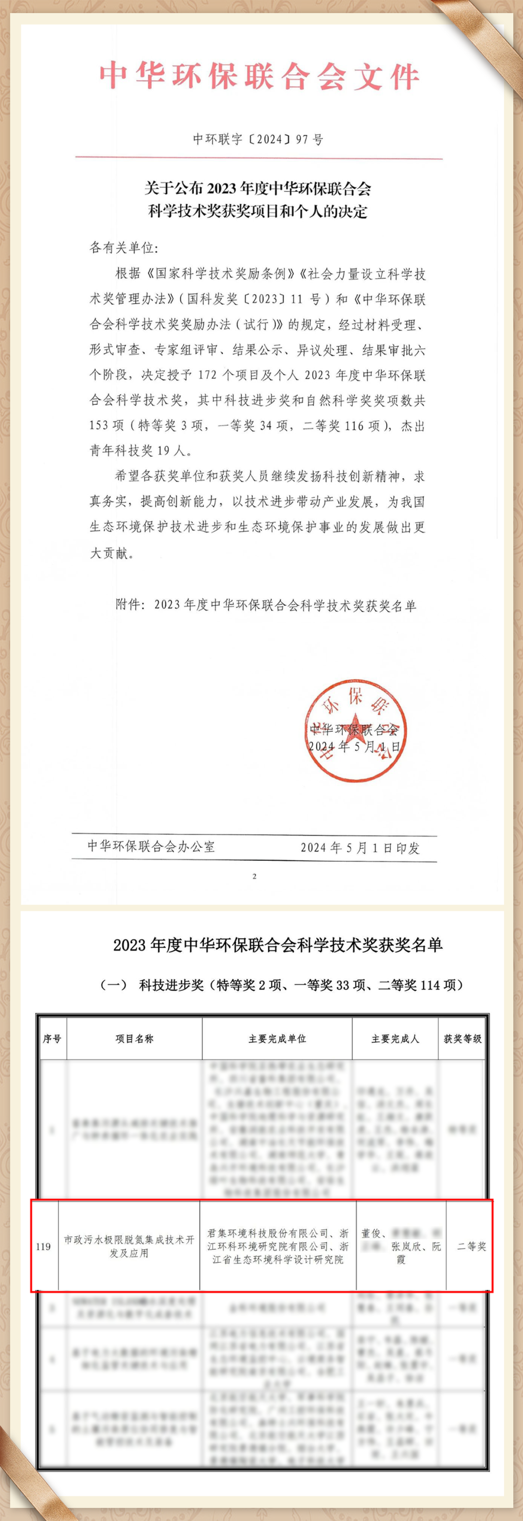 近日,中华环保联合会公布了《2023年度中华环保联合会科学技术奖》评审结果,由乐天使环境科技股份有限公司联合浙江环科环境研究院有限公司、浙江省生态环境科学设计研究院共同完成的《市政污水极限脱氮集成技术开发及应用》项目,凭借卓越的科技创新价值与实际应用成效,荣获中华环保联合会科学技术奖二等奖。